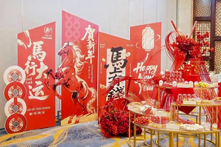 Внутри зала ярко сиял свет, создавая атмосферу тепла и товарищества. Слоган на заднем плане — «Преодолевая границы, фокусируясь на росте» — выделялся ярко и идеально гармонировал с новогодним видением: «Галопом в будущее; ни горы, ни море не помешают нам». Струящиеся красные ленты и украшения, посвященные Году Лошади, усилили праздничный дух, придав этому событию одновременно оживленный и достойный вид.